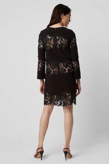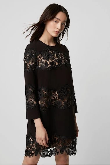 Update your LBD with the stunning black Fenya lace dress from French Connection. The relaxed shift silhouette is adorned with feminine yet modern lace inserts throughout and is finished with a scalloped hem.