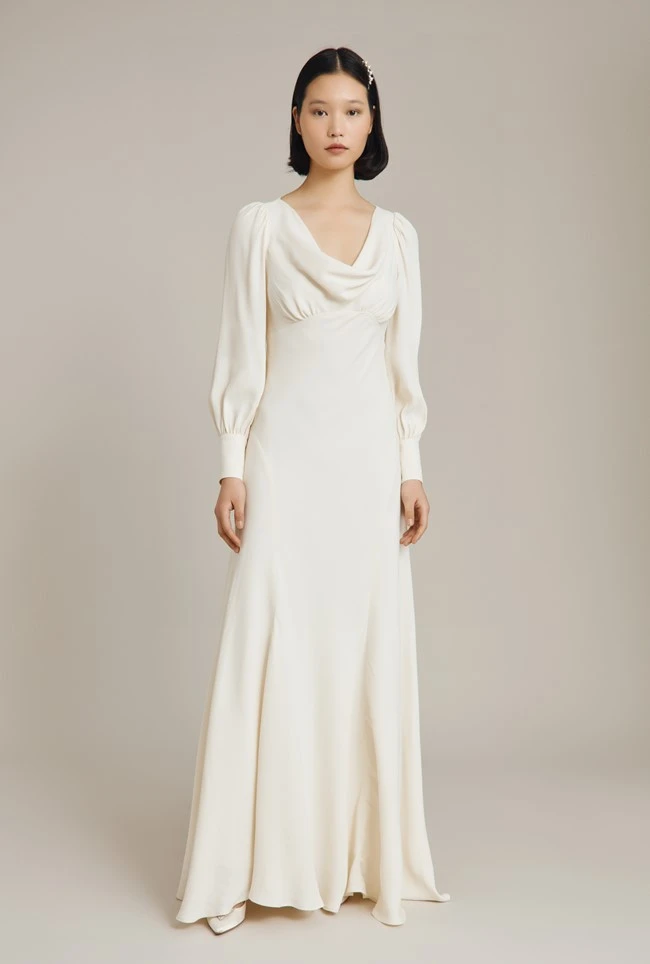 Taking inspiration from classic 1930s designs, Anika is a vintage-infused style rich in elegant details. Its soft cowl neckline is complemented by long blouson sleeves that finish in deep cuffs studded with covered buttons. Cut on the bias with a classic empire line and delicate gathering at the bust, it skims the body to create a beautifully feminine silhouette that falls into a subtle train. Anika features a hidden side zip and is fully lined and crafted in our signature satin-back crepe.