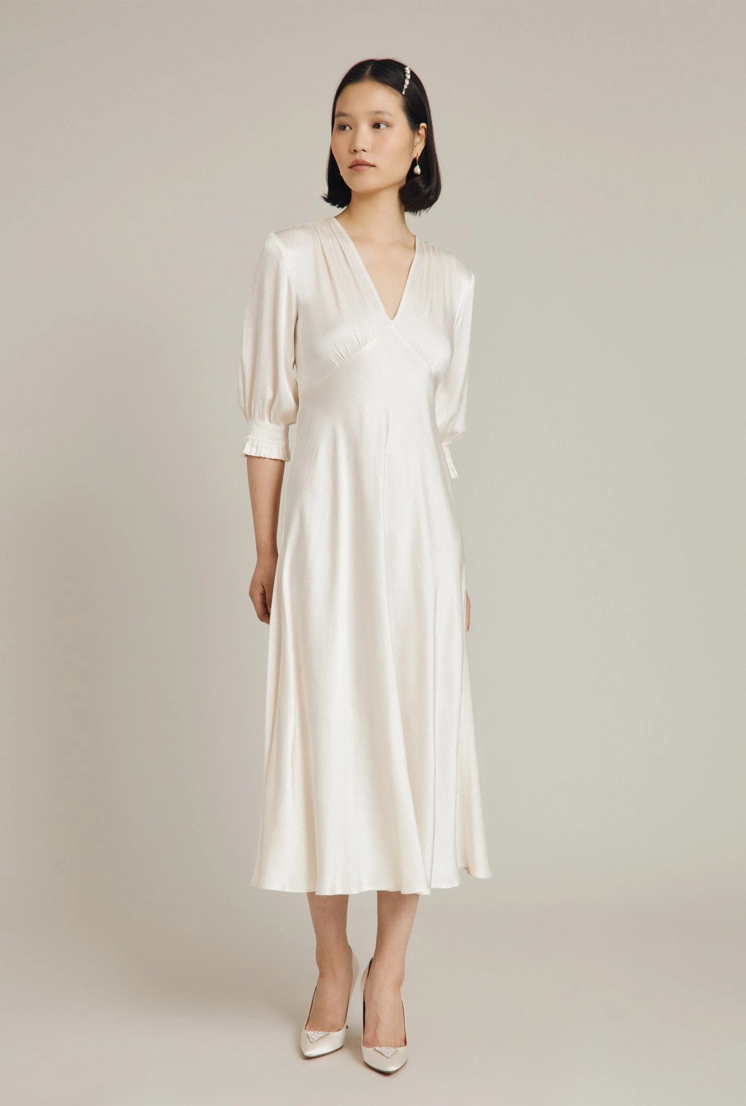 Elle is a classic ‘fit and flare’ style, fitted in the bodice and fuller at the skirt. Featuring a soft V-neck, delicate gathering at the bust and an empire silhouette, it’s crafted from our signature garment-dyed satin. Cut in a midi length, it’s perfect for both formal and more relaxed occasions. The elbow-length sleeves are finished with a gentle ruffle and shirring detail that allows you to adapt the sleeve length by ruching them up to create shorter, more voluminous sleeves if preferred.