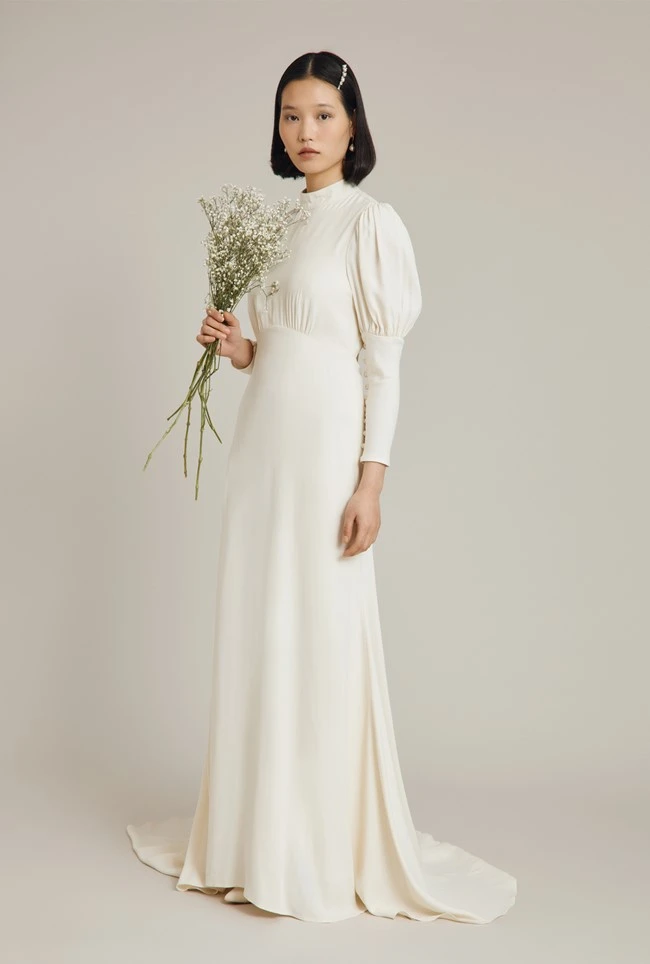 Timeless and elegant, the Laurel dress guarantees a head-turning silhouette for your big day. The purity of its high-neck collar is offset with a dramatic, diamond-shape cut-out and keyhole detail to the back. Its puffed sleeves are beautifully bohemian and cinched from the elbow down into deep cuffs with 10 delicate fabric covered buttons on each side. Cut on the bias into a slim-fitting, empire line shape, it gently hugs the hips. Boasting a train at the back, it includes a hook fastening to allow for easy movement posy-ceremony. The Laurel is made from satin-back crepe and fully lined.
