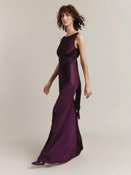 Inspired by our much-loved Salma dress, Olivia in plum is a red carpet-worthy gown with showstopping details. Simple and sophisticated at the front, it features delicate gathering at the bust, an empire line, and a flattering boat neck with cap sleeves. The back is where the drama happens, with an elegant cowl back and subtle but impactful floor-sweeping train. Whether worn as a bridesmaid dress or by a bride for pre-or post-wedding celebrations, itβs a timeless design that exudes Hollywood glamour.