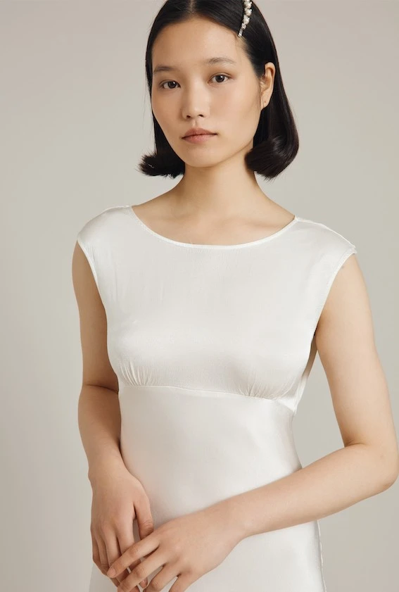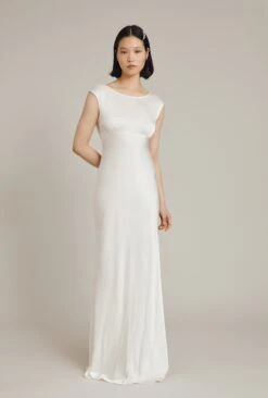 Inspired by our much-loved Salma dress, Olivia in Ivory is a red carpet-worthy gown with showstopping details. Simple and sophisticated at the front, it features delicate gathering at the bust, an empire line, and a flattering boat neck with cap sleeves. The back is where the drama happens, with an elegant cowl back and subtle but impactful floor-sweeping train. Whether worn as a bridesmaid dress or by a bride for pre-or post-wedding celebrations, itβs a timeless design that exudes Hollywood glamour.