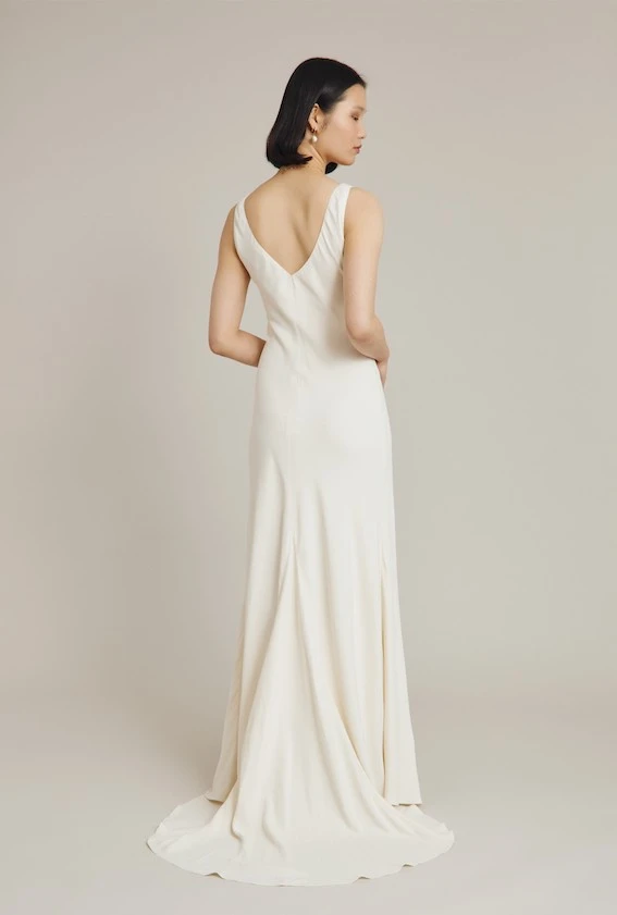 Both truly timeless and beautifully contemporary, Phoebe is a stunning new addition to our bridal collection. A classic bias-cut sleeveless style, this full-length empire line dress falls into a subtle train with a run of delicate fabric-covered buttons studding the front. Practicality has been considered too, with built-up sleeves to allow for undergarments with straps to be worn underneath. Fully lined and made in satin-back crepe, Phoebe’s elegance lies in its simplicity.