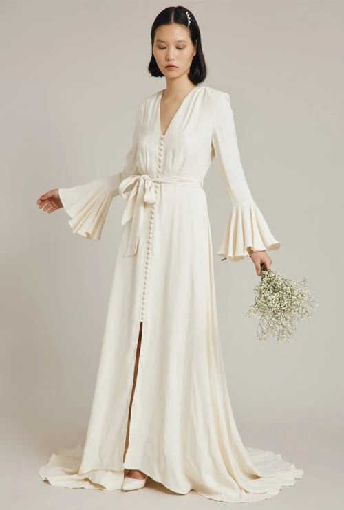 Fusing ‘70s romance with statement details, the Viola dress is a striking design. Universally flattering, its voluminous bell sleeves and fabric covered buttons create drama while the gathered detail around the shoulders and matching waist belt provide soft feminine touches. Beautifully flowing, it includes a hook fastening for the train to allow for easy movement. Made from satin-back crepe and fully lined.