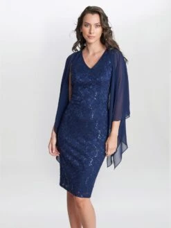 Easy wearing elegance, our Adelaide dress is fashioned in a stretch sequin lace with an attached chiffon cape. The cape features beading at the shoulder. This dress will become your go to for all occasions.