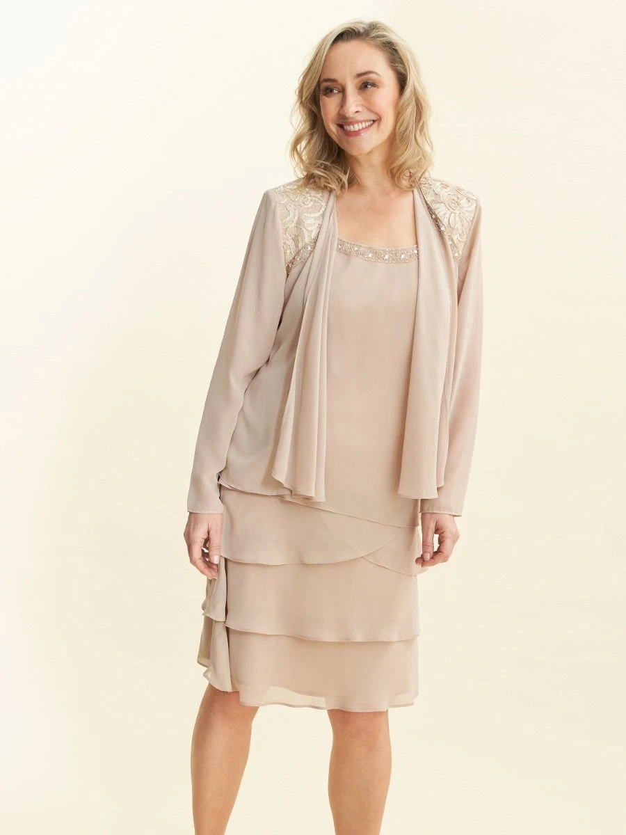 Detailed with a beaded neckline and tiers of flowy chiffon, this tank sheath dress comes with a matching lace-shoulder jacket.