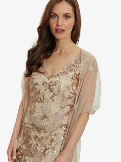 This regal embroidered mermaid dress is luxuriously detailed with godet inserts at the hem. A figure-flattering illusion v-neckline and cap sleeves make this dress the epitome of elegance and the floral embroidery detail adds the perfect touch of femininity. Complete with a matching shawl.