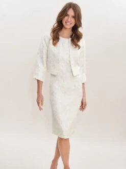 Feel prim and proper in the sophisticated Emeline dress and jacket by Gina Bacconi. The dress features concealed back zip fastening and is fully lined for added protection. This stunning ensemble is perfect for any formal event. Fashioned from luxury floral jacquard material, perfect for the mother of the bride.