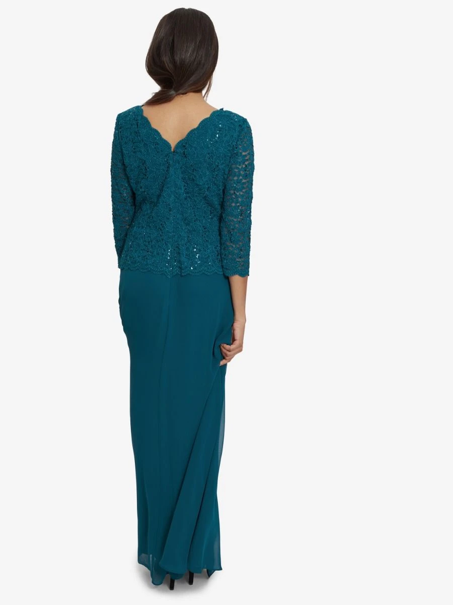 A sequin lace bodice shimmers with a silky chiffon skirt in our classic mock 2 piece A-line gown. Perfect for Mother-of-the-Bride (& Groom)!