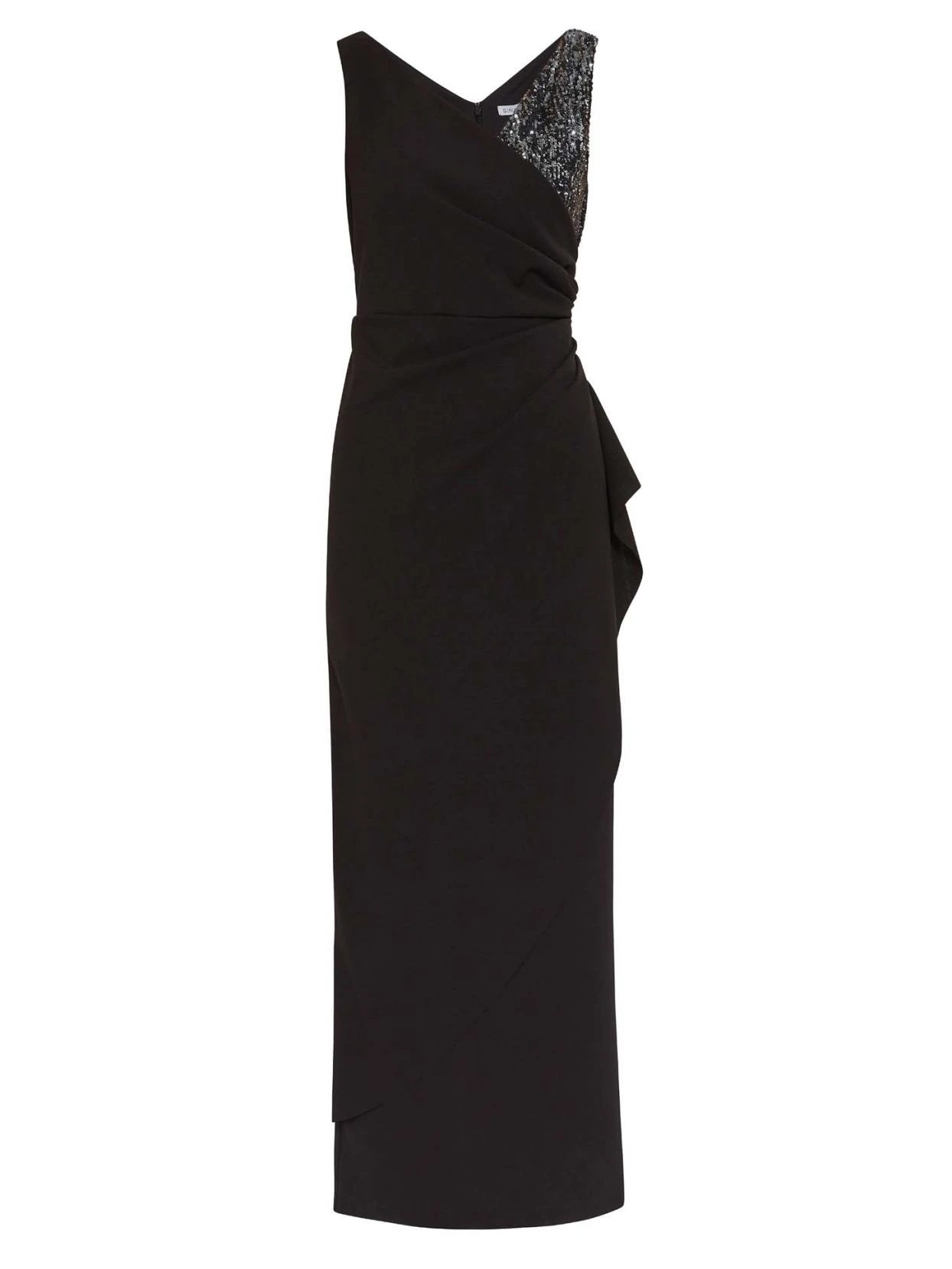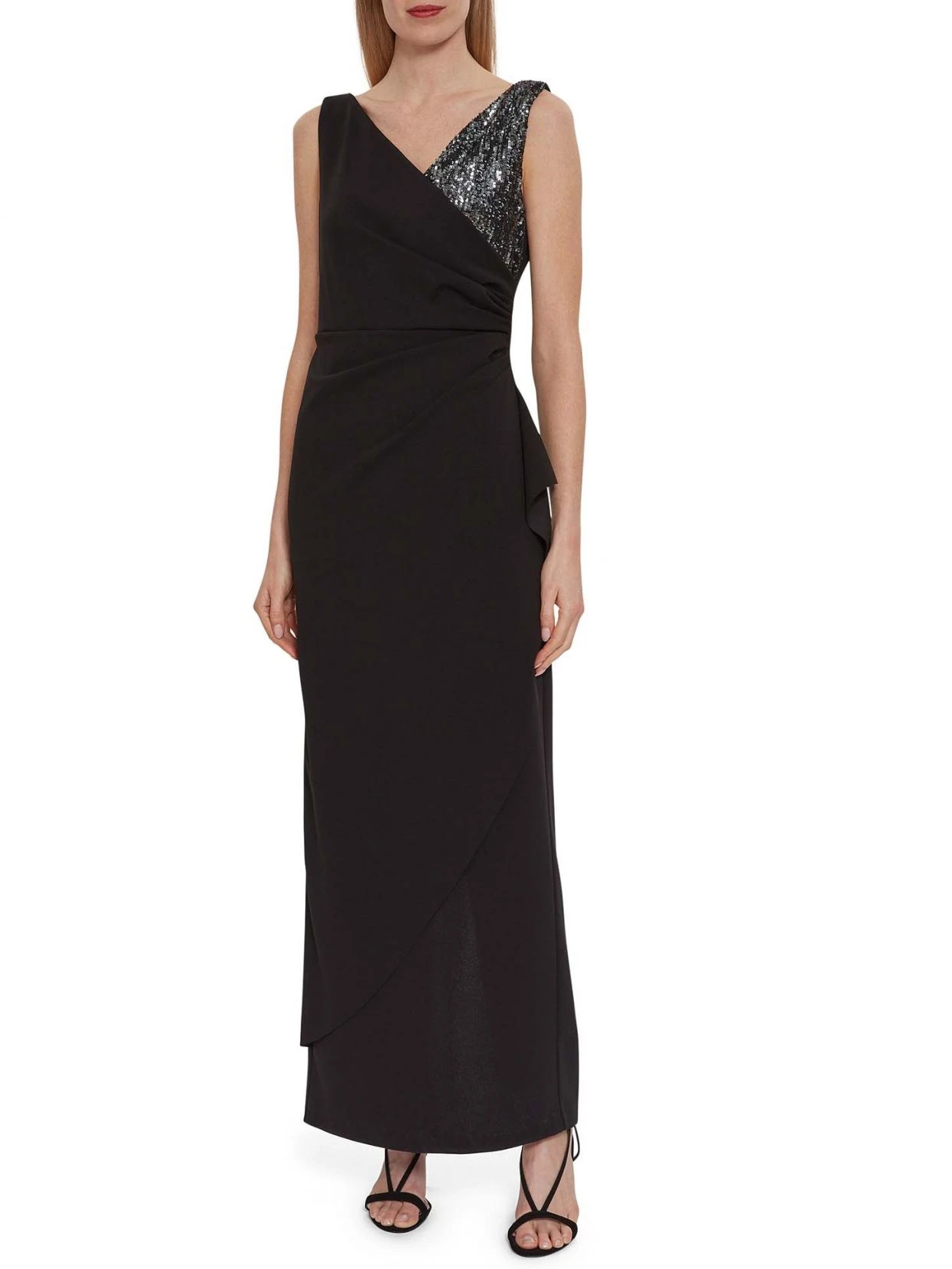 Dazzle everyone at the party in this crepe maxi dress by Gina Bacconi.The dress is fashioned out of gorgeous lightweight moss crepe fabric. The dress features a ruched wrapover bust with sequin panel detailing and an aymetric empire waistline creating an elegant silhouette while the same floaty material creates a waterfall detail. The dress is fully lined and fastened with a concealed back zip.
