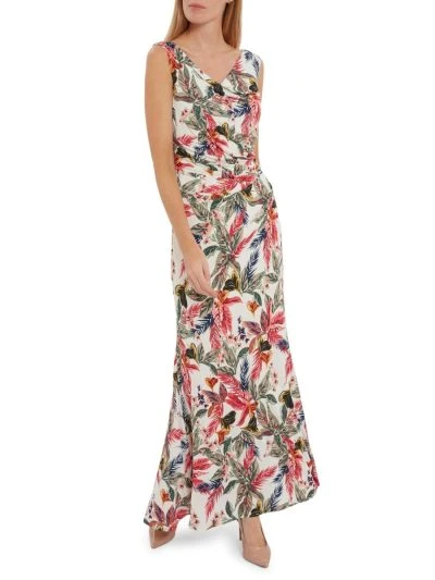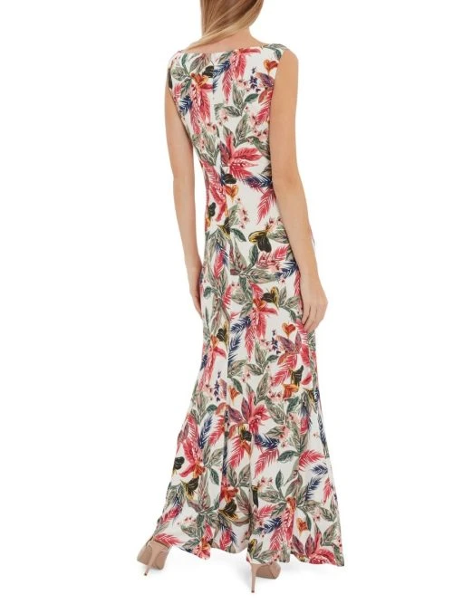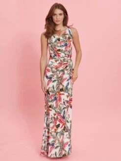 This maxi dress by Gina Bacconi is a showstopper of a piece. This piece is fashioned from a luxuriously soft printed jersey fabric that gracefully wraps over the bodice and ruches at the side of the waist. The asymmetric drape of the dress offers you a flawless silhouette. This dress is fully lined for extra comfort and fastens using a concealed centre back zip.