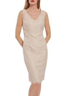 Feel elegant in this metallic corded lace dress by Gina Bacconi. The simple shift dress is cut to flatter with a fitted bodice. The dress also features a classy V-shaped neck and back and a scalloped hem. The dress is fully lined and is fastened with a concealed back zip.