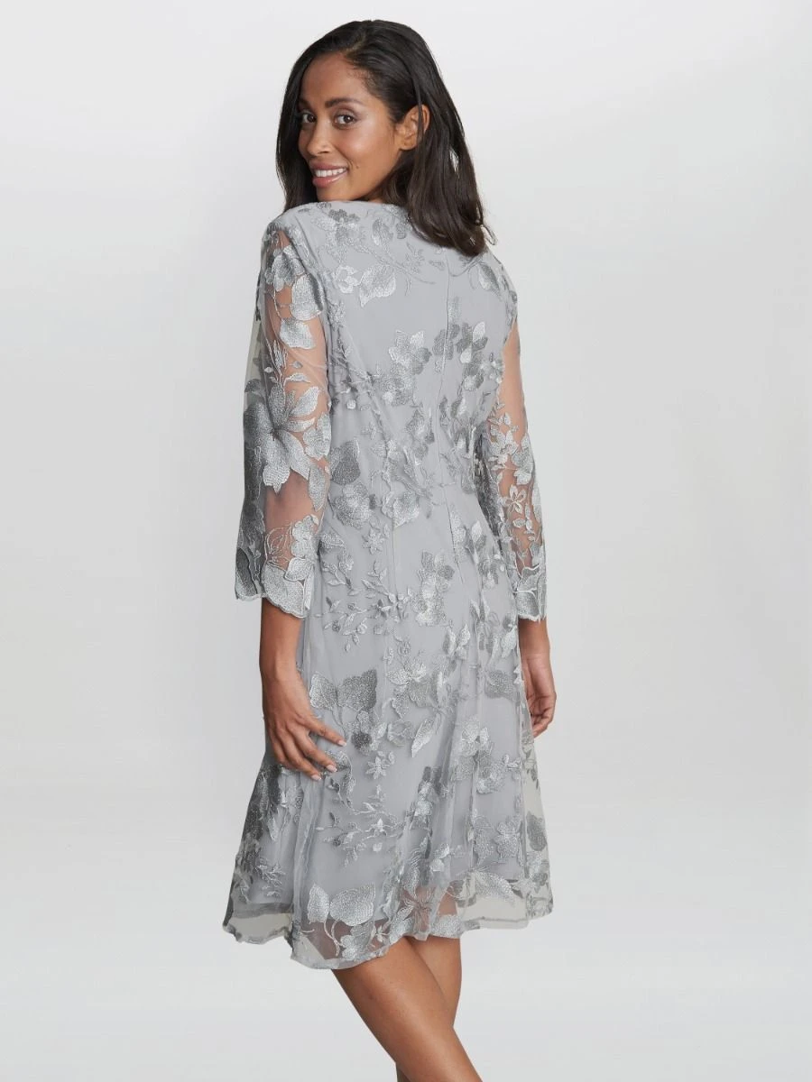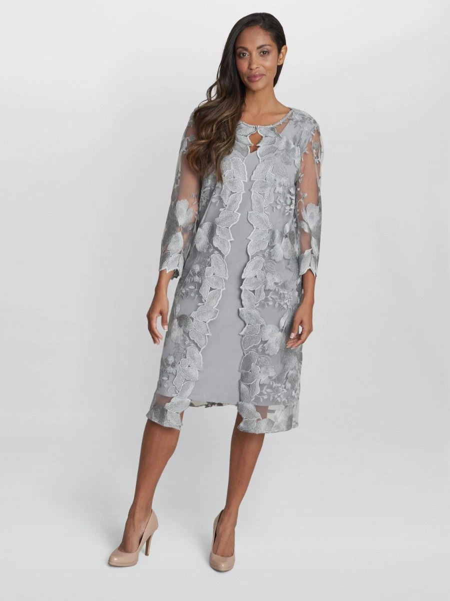 “Gina Bacconi presents its stunning jersey and lace dress. This perfect occasionwear piece is comprised of a classic shift dress overlaid with a detailed floral lace and strewn with light-catching sequins. The lace features a scallop lace which adorns the front of the dress and the sleeve edge. The dress is fully lined and fastens using a concealed back zip. Perfect for a special occasion!