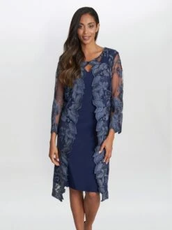 โGina Bacconi presents its stunning jersey and lace dress. This perfect occasionwear piece is comprised of a classic shift dress overlaid with a detailed floral lace and strewn with light-catching sequins. The lace features a scallop lace which adorns the front of the dress and the sleeve edge. The dress is fully lined and fastens using a concealed back zip. Perfect for a special occasion!