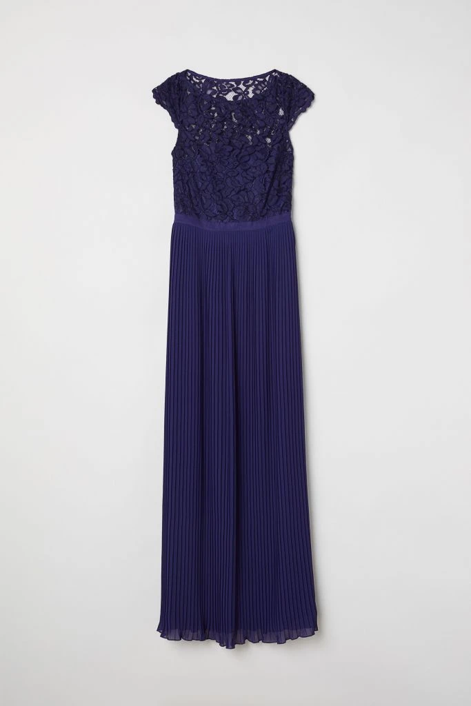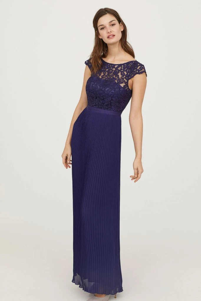 H&M H&M Lace Pleated Maxi Bridesmaid Dress, Dark Blue