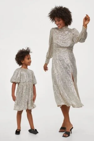 Sparkling dress in sequined mesh for festive occasions. Opening and button at the back of the neck, elbow-length puff sleeves with narrow elastication, a gathered seam at the waist and a flared skirt. Lining in woven fabric made from recycled polyester.