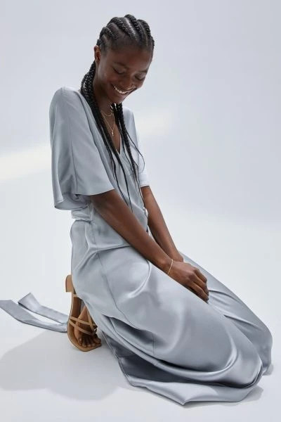 Long dress in softly draping satin with butterfly sleeves, a draped V-neck and a wrapover front with ties at the back. Unlined.