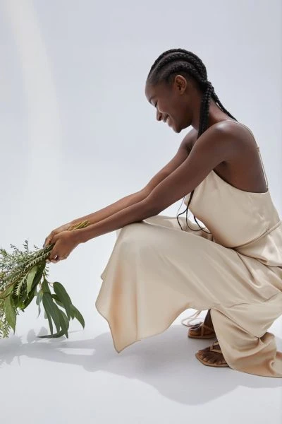Long, fitted dress in softly draping satin with narrow, adjustable shoulder straps, a draped neckline at the front and a V-neck at the back. Concealed zip in one side, a narrow, detachable tie belt at the waist, and a high slit at one side of the hem. Partly lined.