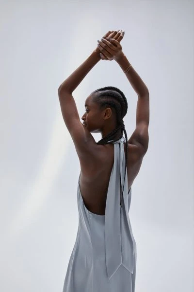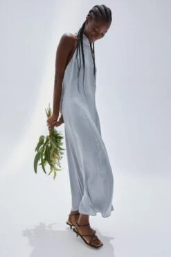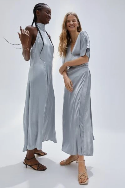 Ankle-length, halterneck dress in softly draping satin. Wide straps that tie at the back of the neck, a concealed zip in one side and an open back. Partly lined.