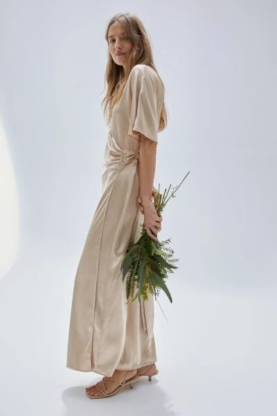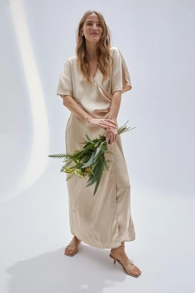 Long dress in softly draping satin with butterfly sleeves, a draped V-neck and a wrapover front with ties at the back. Unlined.