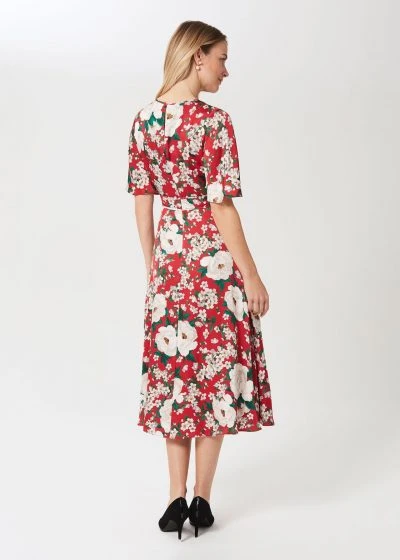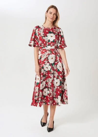 Blossoming with a beautiful floral print, the Bella dress blooms with femininity. Cut from fluid satin for a flattering drape, it comes in a fit and flare silhouette that falls to a modern midi length. Chic, self-covered buttons detail the skirt and shoulder, while flutter sleeves add the finishing touch. Dress up with heels or style more casually with flat sandals. Recycled polyester lining.