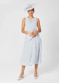 Wedding, garden party, evening event: wherever you’re heading, the Blythe dress will more than step up to the occasion. In a beautiful shade of celeste blue, it’s cut to an ever-flattering fit and flare shape with a detachable tie waist and pleated midi skirt. Piping and gathered detailing trim the neckline, adding a considered final flourish. Style with a navy or matching celeste blue jacket. Made from recycled polyester.