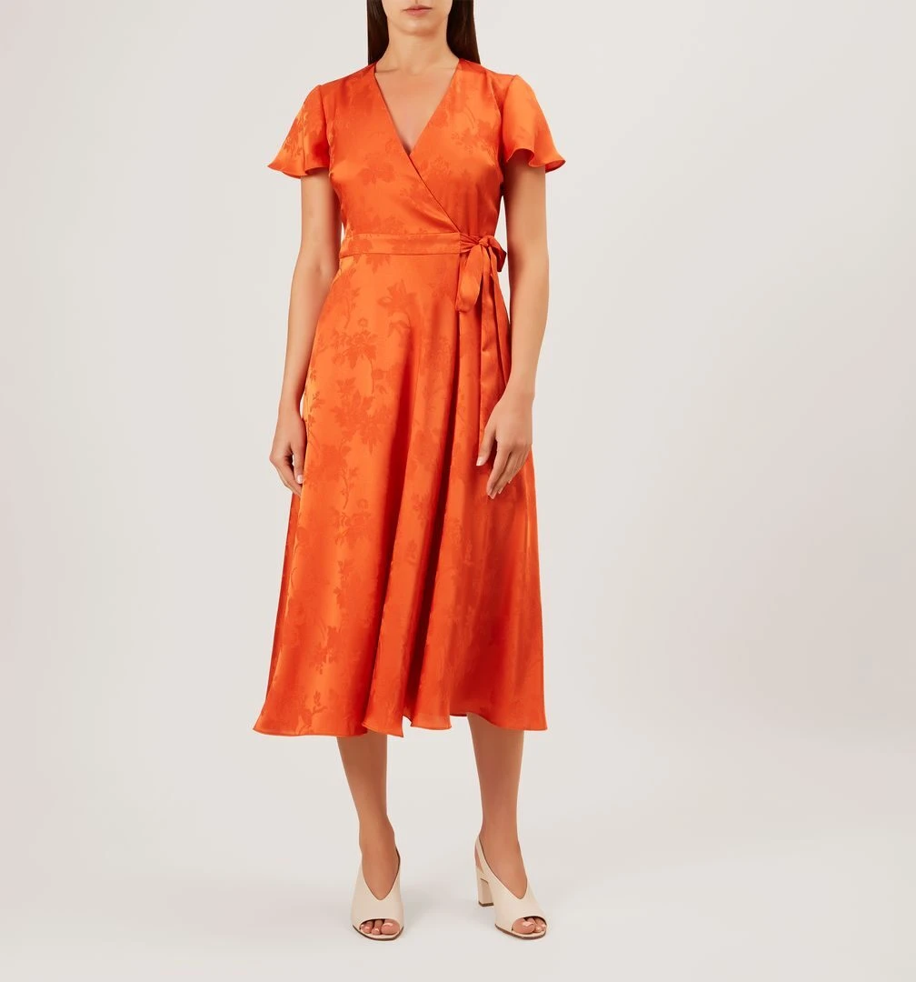 Weddings, garden parties, cocktails on the terrace. Master every elegant dress code with the stunning orange Eleanor Wrap Sleeve Dress. Its flattering relaxed silhouette and bright hue offers lots of styling possibilities. Allowing you to dress it up for weddings or keep it understated for post-work dinner dates. Inject pops of colour or add timeless neutrals.