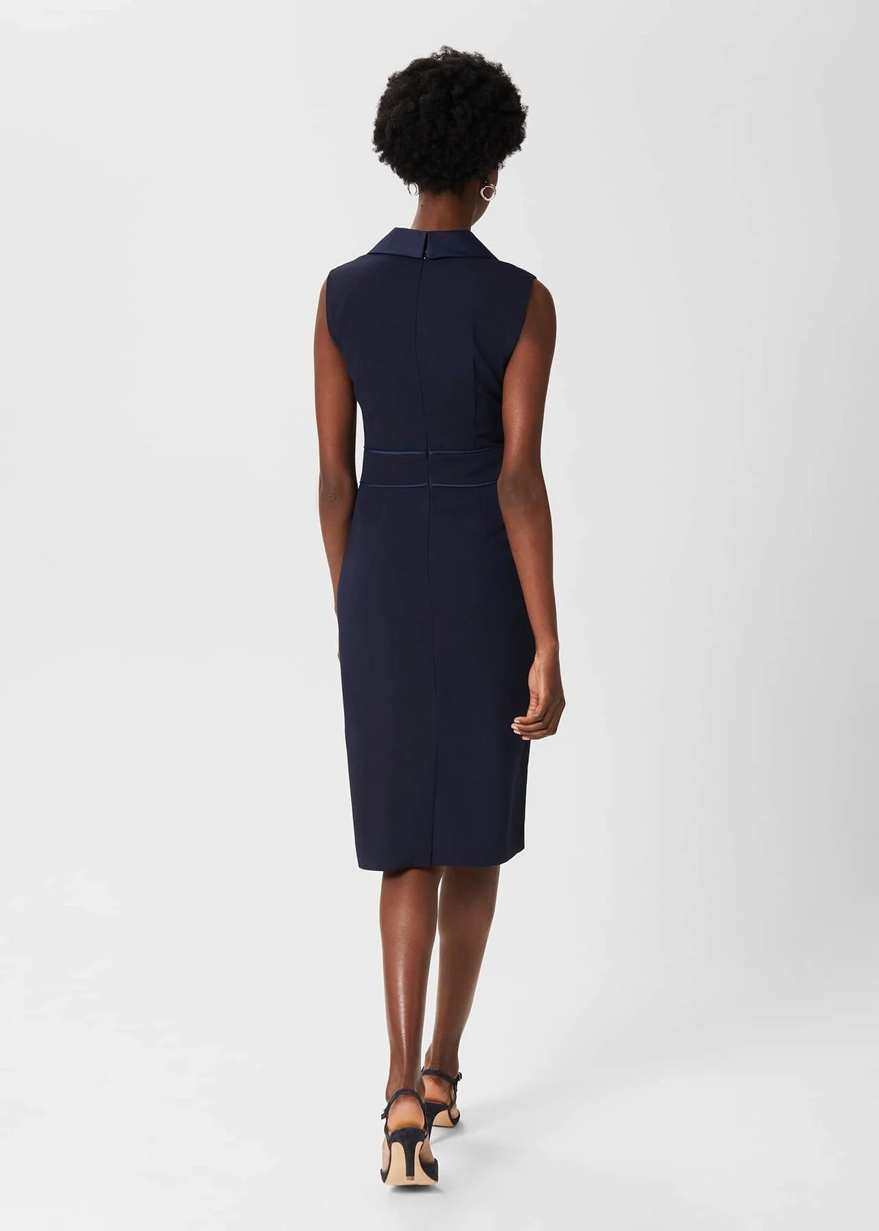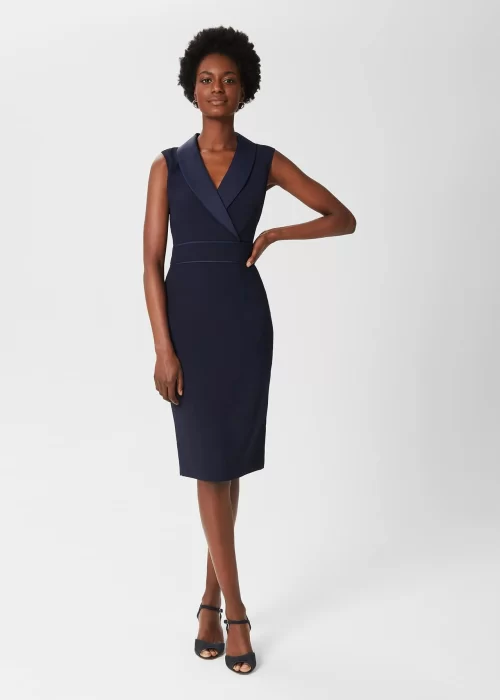 The timeless tuxedo, reimagined. The Kara dress offsets classic suiting details, such as satin shawl lapels, with its feminine silhouette.