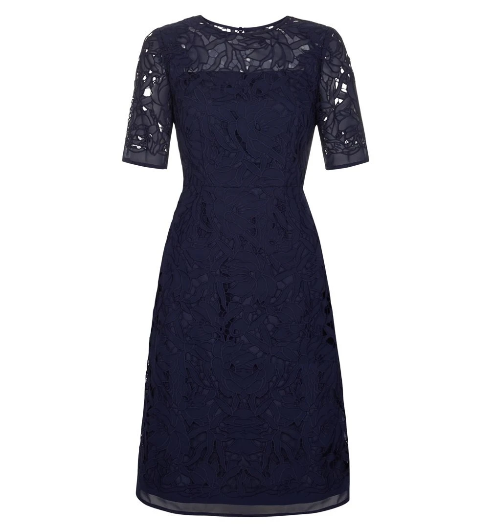 Weddings, garden parties, cocktails on the terrace. Master every elegant dress code with the stunning navy blue lace Mandy dress. Crafted from luxurious lace, its flattering fit and flare silhouette and timeless navy hue offers lots of styling possibilities. Allowing you to dress it up for weddings or keep it understated for post-work dinner dates. Inject pops of colour or add timeless neutrals. You get the picture! Fully lined with concealed zip fastening. Model is 175cm/5’9’’ and is wearing a size UK 8.