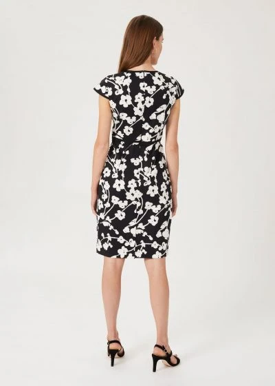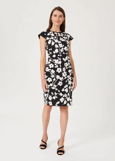 Modern monochrome meets a flattering silhouette. Featuring an abstract floral print, the Sophia dress is cut to a silhouette-skimming shift shape with a contrast grosgrain trim, carefully placed to highlight the waist. Cap sleeves offer coverage while the keyhole cut out adds an elegant touch. Style with the Arizona jacket to create the perfect mother of the bride outfit – or mother of the groom outfit. Crafted from textured cotton-blend fabric.