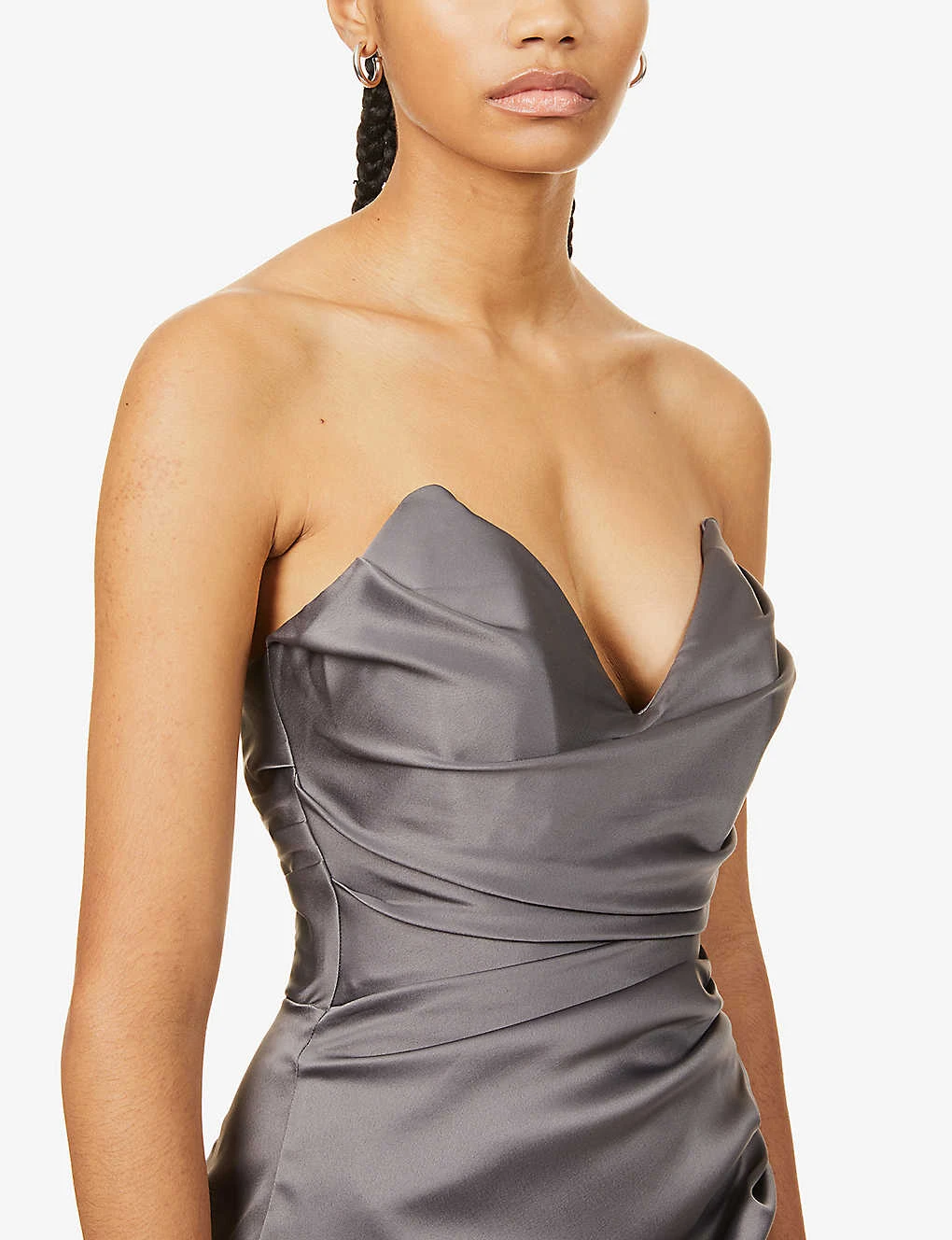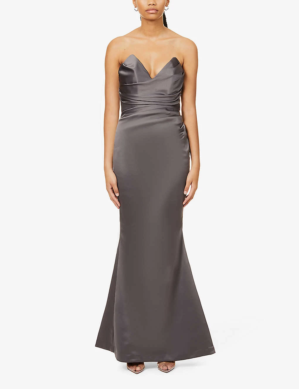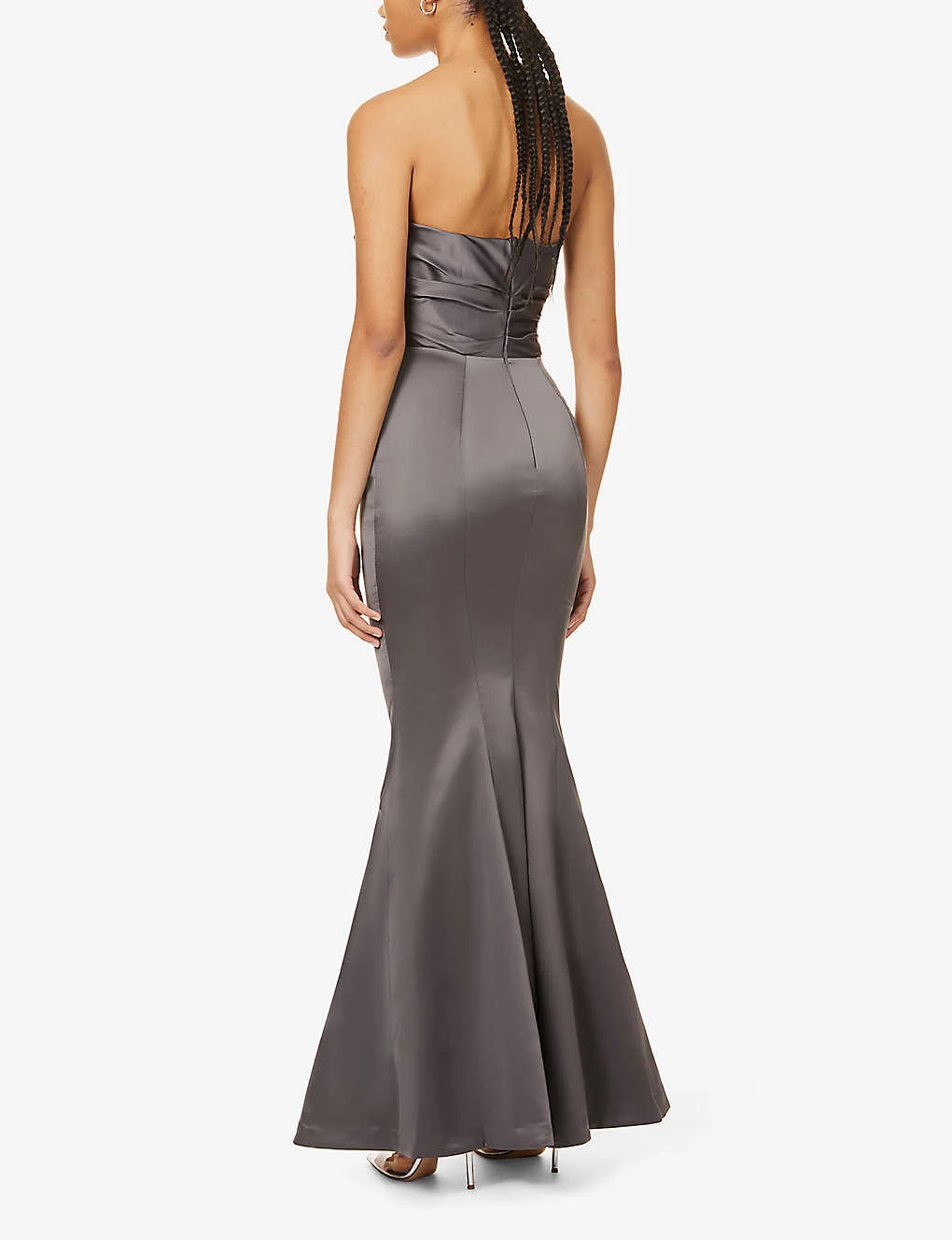 Our ‘Fleur’ gown is cut from our luxuriously soft duchess satin in a dark grey hue and has a beautiful feminine drape. As part of our new bridal collection, ‘Fleur’ will look so chic and elegant as a modern gown but can also be worn for Formals, Balls and any event. The strapless, peaked neckline is elegant and has a boned bodice for structure and support to ensure it flatters every shape.