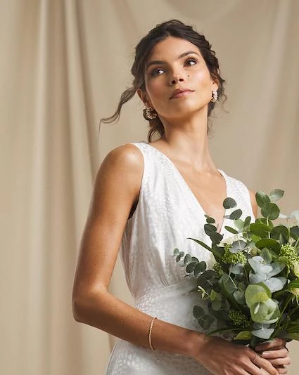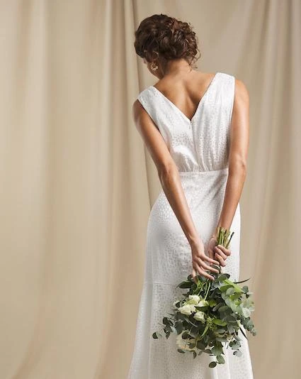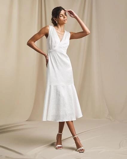 Exclusive to us- Joanna Hope. Our satin jaquard midi dress is the perfect combination of stylish and elegant for the modern bride. Plunge neck and sleeveless makes this perfect dress to go from day to night. Detailed with a zip on the back for the perfect fit. The dress is designed with attention to detail for the most special moments