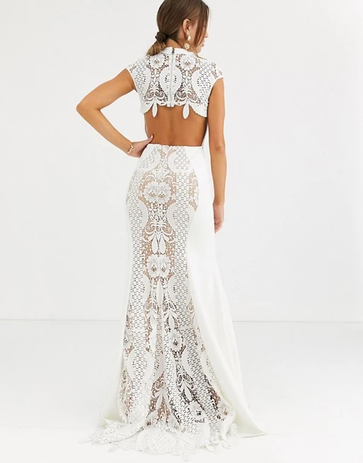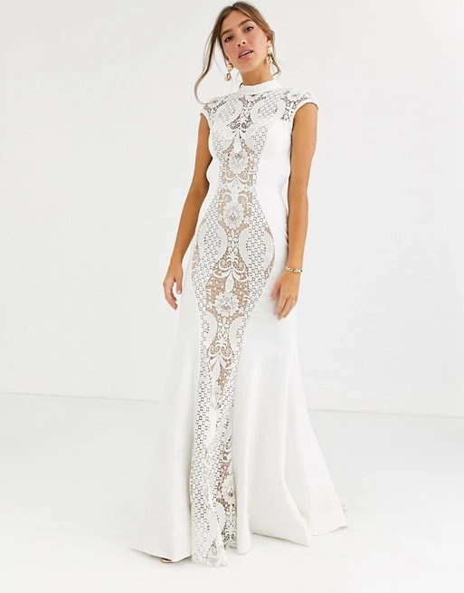 This gorgeous ivory and nude high neck lace fishtail bridal maxi dress features a high neckline, a flattering cinched in lace waist and floor sweeping mermaid skirt. A modern piece ideal for a contemporary bride.