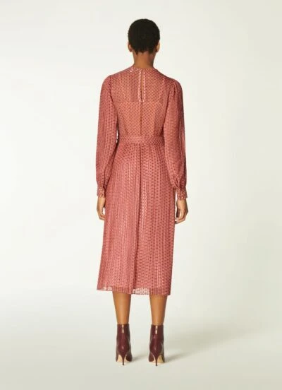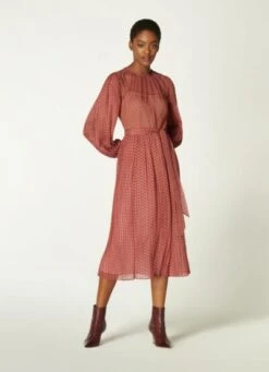 Offering texture to one of our favourite prints, the Felix pleated midi dress in pink is dotted with devoré burnout spots. It has a round neck, puff shoulders, long balloon sleeves, a tie-front belt and falls to just below the knee. Wear it with long boots and layered under knits when temperatures drop.