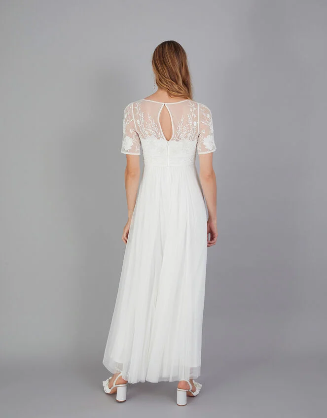 Effervescent with detail, our Ali dress features floral embellishments to the mesh bodice, transitioning onto a Grecian-style band to the waist. From the waist falls an a-line skirt with layers of gauzy mesh for an angelic finish that will swish around the dancefloor during their first dance.