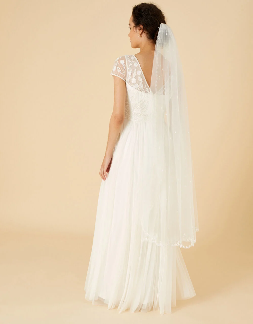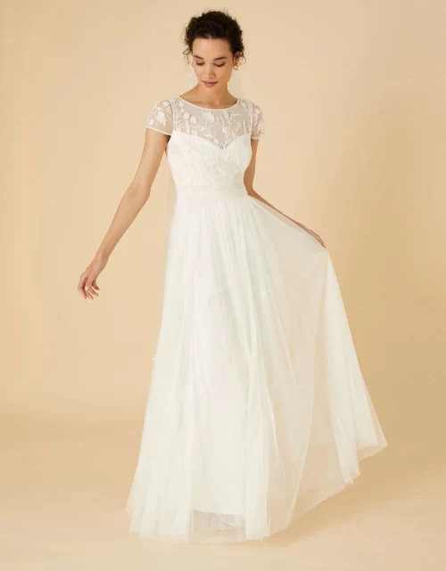 Fashioned in light, floaty tulle, this bridal maxi gown features botanical beading throughout the bodice, adding an element of detail to the dress. Its fully lined skirt falls to floor length, whilst the back dips into a flattering V-shape and secures with a concealed zip.