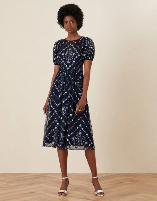 Ted Baker DEYJA Graduated Midi Dress With Ruched Puff Sleeves, Purple/Multi