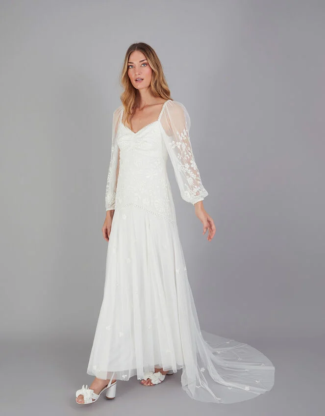 Take their breath away when walking down the aisle in Amelie, our beautifully detailed bridal gown. It boasts a scoop neckline and feminine floral embroidery to the bodice, fitting firmly to sculpt your figure. The skirt flows effortlessly down creating natural pleats, complete with further embroidered flowers to the draped mesh. The reverse offers a scoop back, with a fabric coated button-through fastening and a small bow to the waist for those little touchesof detail.