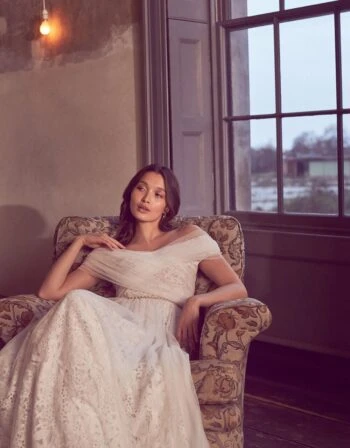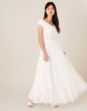 Monsoon Laurie Lace Bardot Mesh Bridal Dress Ivory