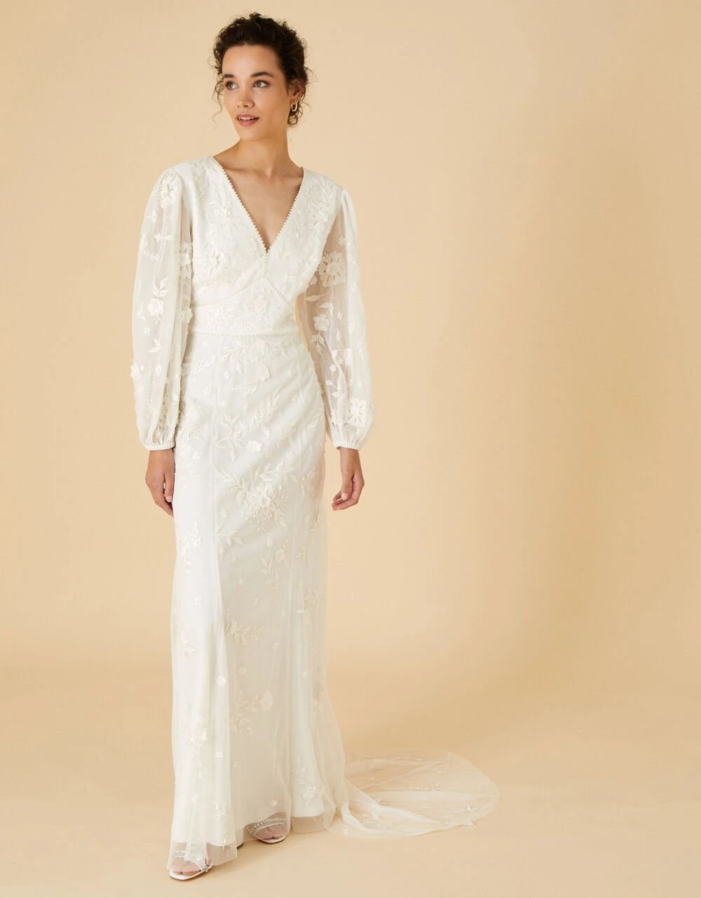 Made with love: this romantic-style dress will enchant your guests with its unique, embroidered, long mesh sleeves and delicate train. Itβs finished with intricate embellishments that cover the dress head-to-toe, sure to add a fairytale twist to your special day.