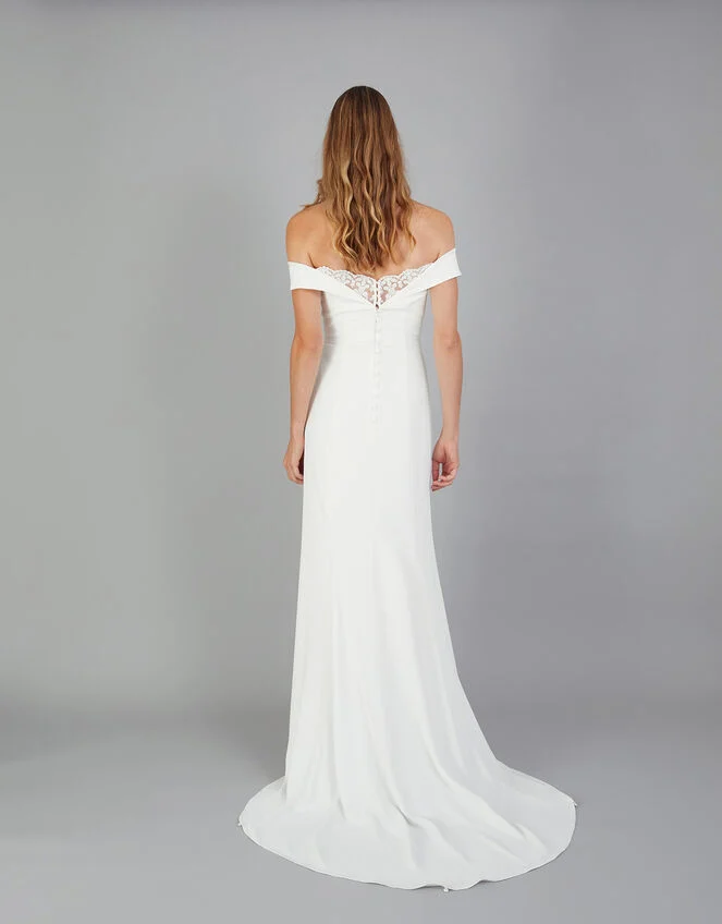 A timeless silhouette with a forever-elegant fit, Nancy is an effortless option for your special day. Sitting off the shoulder as a Bardot neckline, her foldover trim creates a soft yet structured finish and sits gently defined at the empire line. The graceful fall of the skirt begins slim and flares into an A-line cut, extending further around the back to create a traditional train. Spin her around to see the intricate lace insert alongside fabric-covered buttons to fasten.