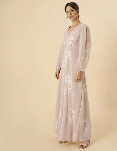 In soft nude with interruptions of ivory embroidered florals, Sammie’s an elegant piece for any occasion. Her airy mesh sleeves balloon out into a bishop style, with a v-neckline and maxi skirt to finish. Style with nude heels and a clutch bag to achieve a delicate look.