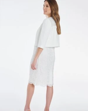 Exclusive to us – Nightingales. In an all-over luxurious lace, this stunning Ivory dress and jacket is fashioned from a corded lace. This beautiful dress is both glamorous and comfortable. With beautiful beading to the waistband and short sleeve. The matching jacket in a stretch crepe fabric and sheer lace yolk provides the perfect cover up whilst still gleaming with glamour. Dress lined in stretch jersey and the jacket lined in a stretch matt satin. The perfect dress and jacket set for a Mother of the Bride or Mother of the Groom outfit, or for that special occasion.