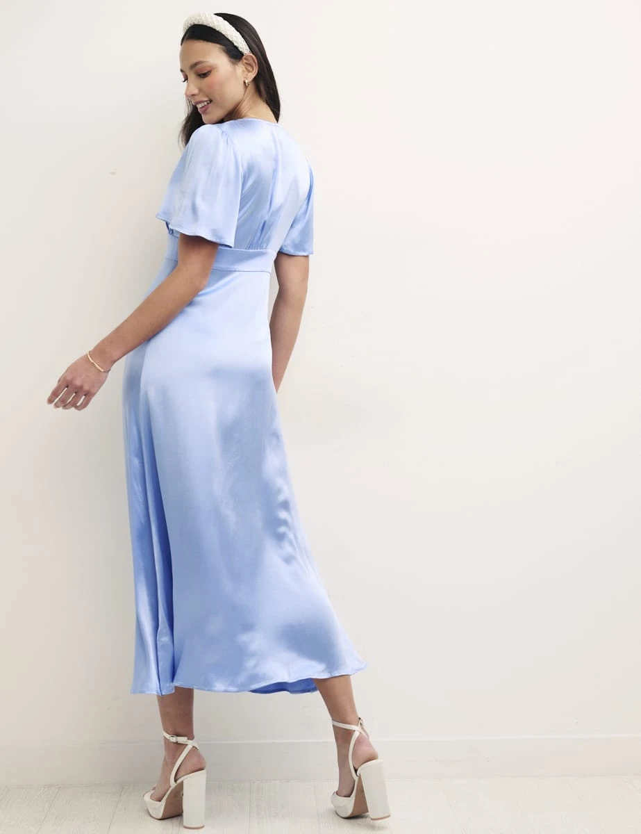 Walk down the aisle with the NC bridal party collection. Looking for more sustainable ways to say ‘I do’? Couple locally grown flowers with responsibly made dresses designed to be worn again and again. Crafted from sky blue satin, Erin is a wedding outfit that’ll do christenings and cocktail soirées too. The cut is impossibly flattering, with a fitted waist and fluted sleeves that fall gracefully to an ankle-grazing hemline. It’s the delicate line up of fabric covered buttons that do it for us though. When the music starts, unbutton a couple to heighten the slit.