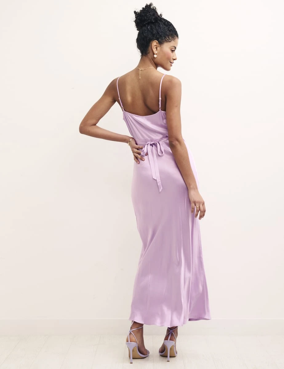 Walk down the aisle with the NC bridal party collection. Looking for more sustainable ways to say ‘I do’? Couple locally grown flowers with responsibly made dresses designed to be worn again and again. This slinky satin slip is framed by barely-there straps and a soft cowl neckline that’s perfect for summer weddings and far-flung destinations. Cut on the bias, the lightly flared midaxi hem is effortlessly flattering. This is Trixie in lavender but she comes in sunkissed peach and olive too. Style elegantly with strappy sandals and a single stem.