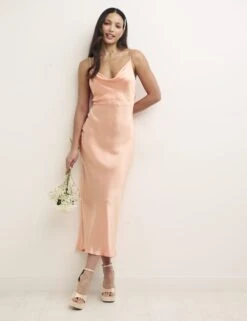 Walk down the aisle with the NC bridal party collection. Looking for more sustainable ways to say ‘I do’? Couple locally grown flowers with responsibly made dresses designed to be worn again and again. This slinky satin slip is framed by barely-there straps and a soft cowl neckline that’s perfect for summer weddings and far-flung destinations. Cut on the bias, the lightly flared midaxi hem is effortlessly flattering. This is Trixie in sunkissed peach but she comes in lavendar and olive too. Style elegantly with strappy sandals and a single stem.