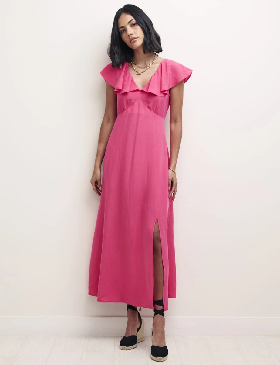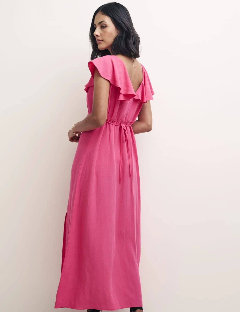 The hot pink trend prevails with our Suki midi design. Made from a responsible viscose blend, the floaty shape gently skims your frame and features a flattering plunge v-neck. With a delicate low back, romantic frills and a subtle slit, sheโs sure to illicit compliments. Add some gold notes and a pair of espadrilles for sun-soaked celebrations.