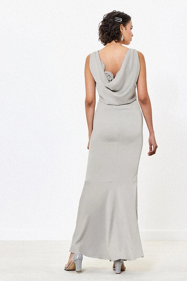 A sleek and slinky silhouette meets a beautiful cowl neck back in this sophisticated maxi dress, perfect for your bridesmaids this season.