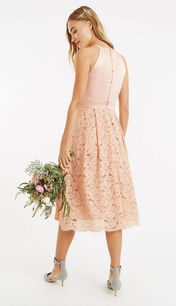 This stunning dusty pink satin bridesmaid dress is perfect for a wedding this season. The romantic lace full skirt has a subtle A-line silhouette which contrasts beautifully with the satin bodice for a feminine style.