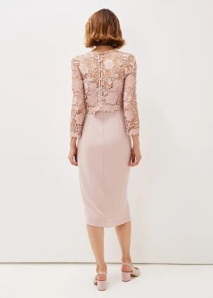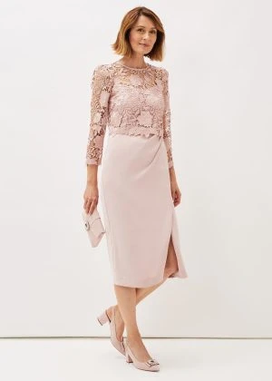 Our Adeline Dress is designed in a sleeveless silhouette with a ruched skirt and modern side split. A detachable long sleeved lace bodice finishes the look. Wear with our complementing Cheryl Frill Coat for a complete Mother of the Bride or Groom outfit.